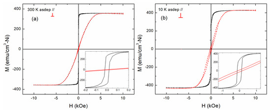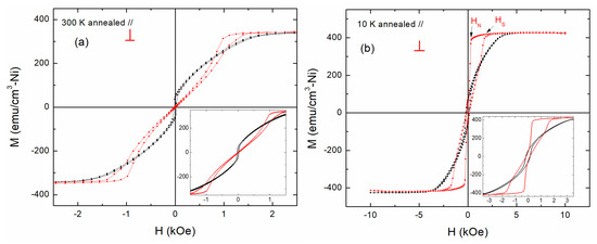 For the loops with the field applied perpendicular to the field plane, one may observe a drastic change compared to the ones in Figure 2: one may identify a HN (nucleation field), where it is known that perpendicular magnetic bubble domains appear. This is concluded by the characteristic shape of the loop; for example, see Ref. [42]. Kashuba and Pokrovsky found that the mathematical expression of the magnetization as a function of the field below HN for an ideal curve without hysteresis for films breaking into domains is of the form M ∝ arcsin (H/HN) [43,44]. This phenomenon is clearer at T = 10 K, where the perpendicular direction clearly becomes an easy axis, as is shown in Figure 7b. On the other hand, at room temperature, the loops with the field applied parallel or perpendicular to the film plane are twisted one to the other, and the only way to get an idea of which axis is easy is to find the sign of the area between them. The significant decrease in the saturation field HS in the perpendicular field direction as temperature decreases may indicate that a spin reorientation transition (SRT) takes place. We will come back to this in Section 4.