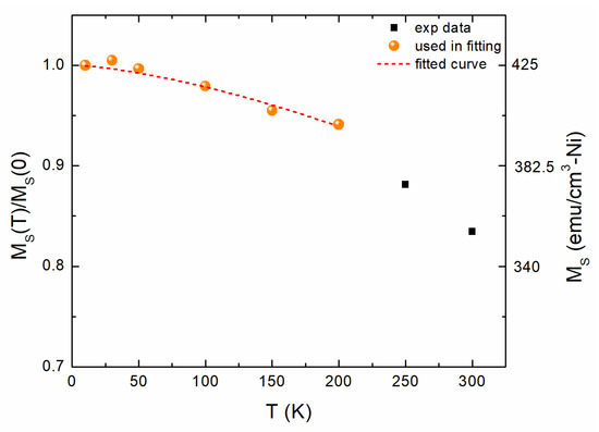 In Figure 3a, we present the temperature-dependent saturation magnetization Ms(T). One may assume that the Curie point of our multilayer with relatively thick nickel layers should not be much smaller than that of bulk Nickel (approximately 627 K [36]). Moreover, it is well known that up to about 30% of TC is in the spin-wave regime [36]. Then, one may fit the temperature dependence of magnetization up to 200 K using the classical Bloch’s law [36]: