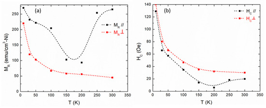 Figure 4 presents temperature-dependent remanence magnetization, MR, and the coercive field, HC, for the as-deposited sample. As we have seen in Figure 2, the remanent magnetization for the parallel field increases at room temperature. This is related to the commonly observed effect of a uniaxial anisotropy, which decreases faster than the shape anisotropy, as we will discuss below.