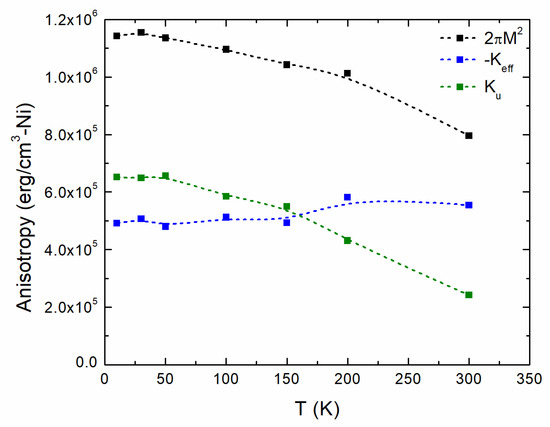 where the term 2πMs2 is the shape anisotropy of a thin film, and Ku is the first-order uniaxial anisotropy constant, which is the dominant one in polycrystalline films due to the cylindrical symmetry of the system (isotropic in the film plane). Ku includes all contributions (magnetocrystalline, magnetoelastic, interfacial, and surface anisotropy), and when it is positive, then it favors the perpendicular to the film plane direction to be an easy magnetization axis. This property (PMA) is desirable for technological applications [39]. However, as shape anisotropy competes against uniaxial anisotropy, for the actual existence of an out-of-plane easy magnetization axis, Keff should be positive too. Figure 5 presents the evolution of the various anisotropy contributions as a function of temperature.