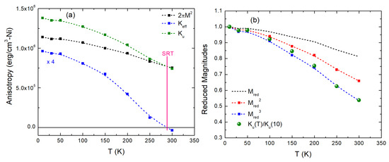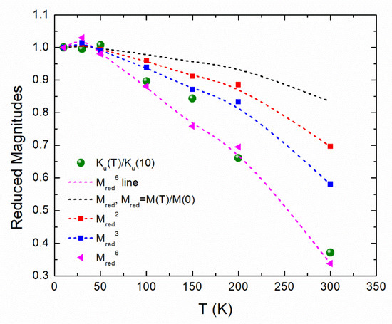 An interesting observation is that the shape anisotropy and uniaxial anisotropy vary almost in parallel, resulting in nearly constant effective anisotropy. In fact, it even slightly increases with temperature towards room temperature, leading to an increase in MR and HC in the parallel field near room temperature, as Figure 4 reveals. On the other hand, the theory predicts the temperature dependence of shape anisotropy from the square of the normalized magnetization Mred = MS(T)/MS(0) and that of the normalized uniaxial anisotropy from the cube of the normalized magnetization, indicating a faster decrease with temperature [40,41]. In Figure 6, we compare the temperature variations of the normalized uniaxial anisotropy in order to verify if the normalized uniaxial anisotropy follows the third power of normalized magnetization. The attempted fitting is based on the following:
