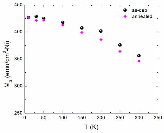 Figure 8 illustrates the temperature dependence of magnetization MS before and after annealing, between 10 and 300 K. We observe a tiny decrease in magnetization in the annealed sample. This could be attributed to some further interdiffusion occurring at the Ni and Pt interface, leading to a slight reduction in the TC. Consequently, the magnetization in the annealed sample exhibits a slightly faster decrease with temperature compared to the as-deposited one.