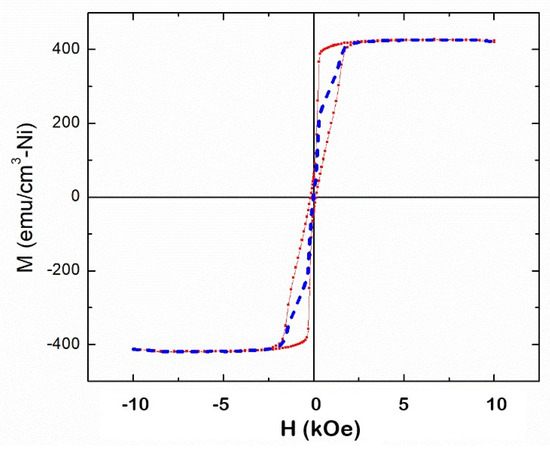 where A is a constant that, for bulk Ni, has a value of 0.75 × 10−5 deg−3/2. The fitting in Figure 3b gives for our film the value A = 2.5 × 10−5 deg−3/2, which is larger than the one of bulk nickel and even slightly larger than the one for the multilayer 6 × Ni(7 nm)/NiO (1.4 nm) in Ref. [24]. Multilayers’ temperature-dependent magnetizations always show a larger value of A than bulk materials due to finite-size effects [37].