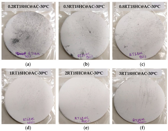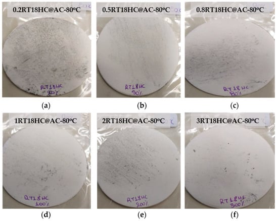 Leaching tests were performed for the RT18HC@AC samples with different RT18HC loadings (20, 50, 80, 100, 200, and 300% w.t.) according to the procedure explained in the experimental section. Figure 1 and Figure 2 show the filter papers after the leaching tests at 30 and 80 °C, respectively. The absence of paraffin observed on the filter papers after the leaching tests (no oily marks are apparent) is an important feature that indicates the efficacy of the RT18HC@AC composite in encapsulating and retaining the RT18HC component. This observation suggests that the composite material exhibits a high degree of stability under the specified leaching conditions and no leaching of the PCM phase.