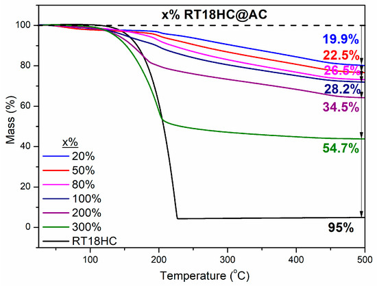 Thermogravimetric analysis (TG%) curves of AC-RT18HC hybrids with different RTHC18 loading during the synthesis.
