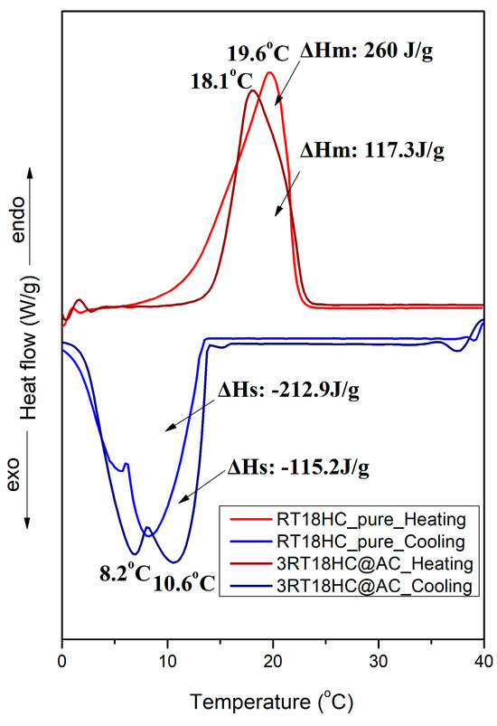 DSC curves of 3RT18HC@AC composite in comparison with the corresponding curves of pure RT18HC.