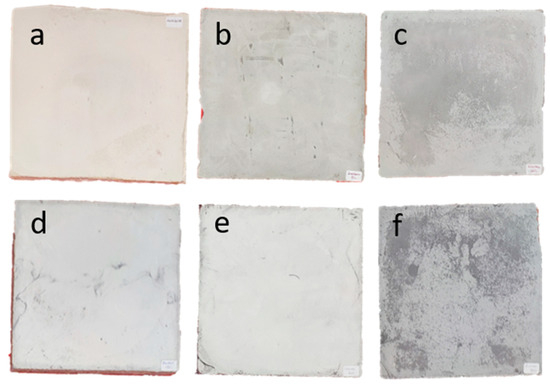 (a) Reference gypsum board (GB) and GB/RT18HC@AC composite boards (200 × 200 × 12.5 mm) with (b) 5, (c) 10, (d) 15, (e) 20, and (f) 30% w.t. RT18HC@AC.
