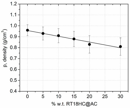 Figure 5 displays the images of the reference gypsum board (GB) and the GB/RT18HC@AC composite boards. The results of the density measurements are presented in Table S1, and the plotted versus % w.t. content of 3RT18HC@AC are shown in Figure 6. The density results reveal a systematic reduction in the density of gypsum boards with an increase in the RT18HC@AC additive content. The reduction in density is attributed to the incorporation of the RT18HC@AC additive, which introduces lightweight particles into the matrix of the gypsum. Despite the reduction in composite densities with an increasing additive content, all composites still meet the minimum density requirement of 0.60 g cm−3 set by the European regulation UNE-EN 13279-1 for gypsum binders and gypsum plasters [57,58].
