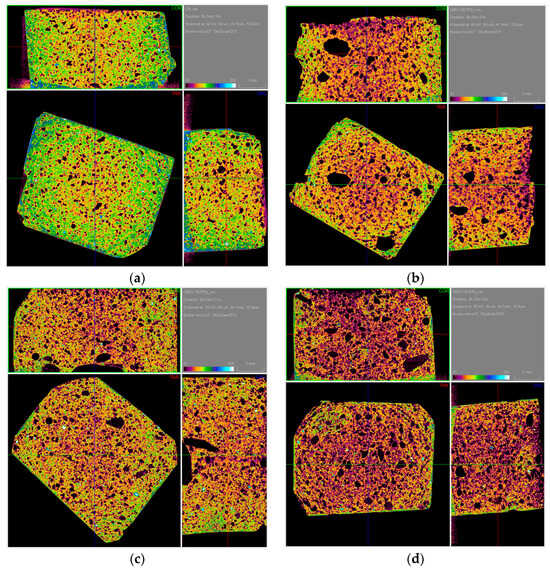 To validate the findings and examine the structure of the gypsum, X-ray computed microtomography (μCT) was performed. These results provide critical insights into the relationship between the additive concentration and the microstructural characteristics of the composites. The microscale images (Figure 7) reveal distinctive features corresponding to the different levels of additive incorporation. The colored scale bar in the images refers to the different X-ray attenuation values, and as a result, the different physical density values of the gypsum board components, beginning from the lower index (black) to the higher index (white). The black spots in all images correspond to the lower intensity areas (air voids), which are the porous areas of the boards. In the case of the GB reference board, the images mainly consist of green- and yellow-colored areas. At a 10% additive concentration, the microtomography images show initial alterations in the material’s density, with obvious differences in the RT18HC@AC particle distribution. The images exhibit less green and yellow areas, while new red and purple areas (lower index components) appear. The last probably corresponds to RT18HC@AC particles, which are observed to be homogeneously integrated into the gypsum matrix, marking the beginning of structural modifications. When increasing the additive concentration to 20% and 30%, these lower index areas (red and purple coloured) become more intense, resulting in a more pronounced impact on the internal architecture. The microtomography images demonstrated an enhanced homogeneity in RT18HC@AC dispersion, even at the board with 30% additive, indicating a uniform integration within the gypsum matrix.