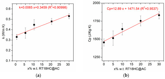 Graphical plot of GB/RT18HC@AC. (a) Thermal conductivity, k, and (b) specific heat capacity, Cp, versus % w.t. content of RT18HC@AC additive.