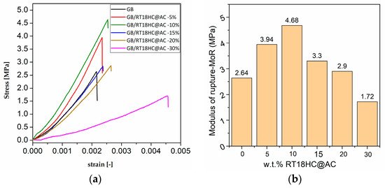 Results from the bending tests. (a) Stress–strain curves and (b) the modulus of rupture for the gypsum boards with varying % w.t. contents of RT18HC@AC additive.