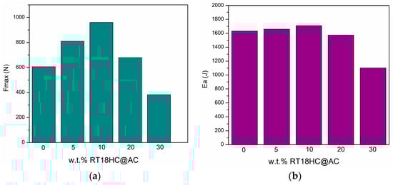 Results from the impact resistance tests. (a) Maximum load, Fmax, and (b) absorbed energy, Ea, for the gypsum boards with varying % w.t. contents of RT18HC@AC additive.