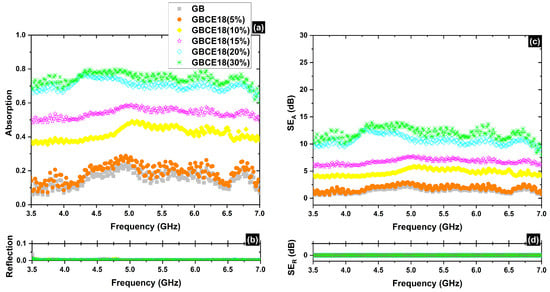Figure 11 depicts the absorption (Figure 11a) and the reflection (Figure 11b) spectra of the GB/RT18HC@AC composite samples for a series of additive RT18HC@AC concentrations in the frequency range of 3.5–7.0 GHz. Figure 11b clearly illustrates that the reflection of the samples is almost zero for all of the additive concentrations from 0.00 to 30% w.t. As a result, the EMI shielding effect due to reflection (SER) is also negligible (see Figure 11d), and in all cases, the total SE is simply SET = SEA (see Equation (4)), which is in agreement with the results of other research groups working on carbon allotropes [66]. Clearly, the dominant shielding mechanism is absorption, which is also supported by the continuously increasing absorption levels with an increasing RT18HC@AC content in the gypsum board composites.