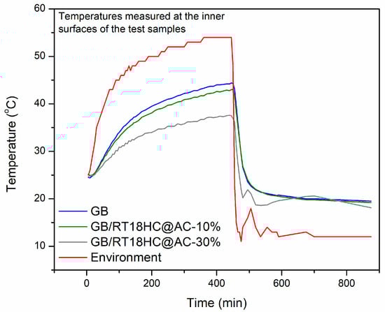 During the initial stage of the heating process, all test samples exhibited a similar rate of temperature increase. The primary distinction lay in the maximum temperatures recorded. It is evident that the gypsum board with a higher phase change material (PCM) content demonstrated an ability to sustain a lower indoor room temperature for an extended duration. The temperature values of the internal surface (at the plateau of the plots) were 44.4, 43.0, and 37.5 °C for GB, GB/RT18HC@AC-10%, and GB/RT18HC@AC-30%, respectively, while the corresponding temperature values measured at the external surfaces were 46.5, 48.2, and 43.0 °C, respectively. The difference between these values (external-internal) are 2.1, 5.2, and 5.5 °C, respectively.