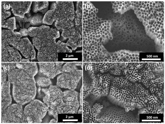 FESEM micrographs depicting a top-view of nanotubes as-produced (a,b) and after heat-treatment at 500 °C, for 3 h (c,d).