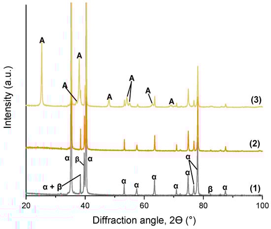 X-ray diffractograms of the Ti6Al4V alloy as-received (1), as-anodized (2), and thermally treated post-anodization at 500 °C for 3 h (3). α and β refers to the α- or β-phase of the alloy substrate, respectively, while A refers to the anatase of the crystalline TiO2.