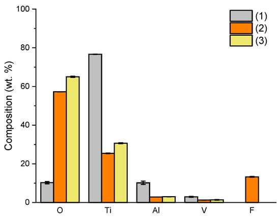 Figure 3 presents the chemical composition of oxides obtained by EDXS for the samples after each surface treatment. As reported in the literature, the as-produced anodic oxide contains small amounts of fluorides, which are only removed via heat-treatment [,]. Moreover, the surface treatments led to a change of the O/Ti ratio (wt.%) due to the much thicker surface oxide present after anodization and post-anodizing heat treatment.