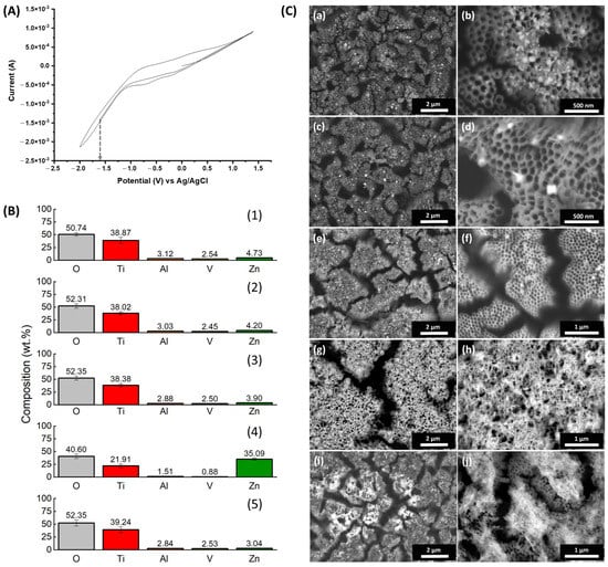 Electrodeposition of ZnNPs on anodized Ti6Al4V samples: (A) The cyclic voltammogram obtained in a 3.2 mM Zn(NO3)2 on anodized Ti6Al4V samples; the grey arrow indicates the selected potential for the reduction of Zn on the surface of the TNTs sample of −1.6 V vs. Ag/AgCl; (B) The results of EDXS composition analysis taken on the top of the functionalized TNTs surface over a 10 × 10 µm area; the values listed are the mean values of 15 independent measurements. (C) FESEM micrographs depicting a top-view of the nanotubular layer after electrodeposition of ZnNPs. For (B,C): (1),(a,b) deposition for 10 min, at room temperature with no mixing; (2),(c,d) deposition for 15 min, at room temperature with no mixing; (3),(e,f) for 30 min, at room temperature with no mixing; (4),(g,h) deposition for 15 min under ultrasound at room temperature; (5),(i,j) for 15 min, with no mixing at 70 °C.