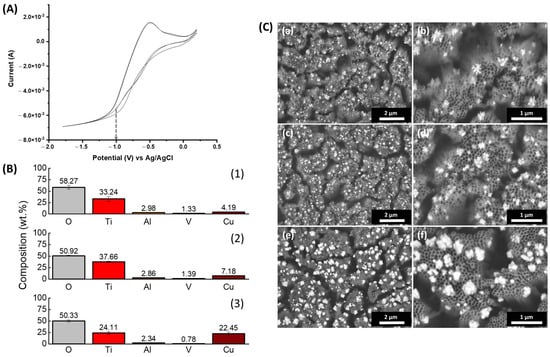 Figure 5 depicts the cyclic voltammogram, chemical composition, and morphology of the samples obtained through electrodeposition of CuNPs into the TiO2 nanotubes produced on the surface of the Ti6Al4V alloy. In Figure 5A, a representative CV curve for the electrodeposition of Cu on heat-treated TNTs at a scan rate of 0.1 V/s and a potential ranging from −2.0 V to 0.5 V in a 3.2 mM CuSO4 aqueous solution is shown. The electrolyte was a CuSO4 solution acidified at pH 2 with H2SO4 and the deposition was carried out in a three-electrode system using heat-treated TNTs as the working electrode, Pt as the counter, and Ag/AgCl as the reference electrode. Two reduction peaks can be distinguished, a first one at about −0.36 V vs. Ag/AgCl and a second one at about −0.8 V vs. Ag/AgCl. Considering this, for optimization, the deposition of Cu was attempted at different applied potentials (−0.6, −0.8 and −1), times (90, 180 s), and with or without ultrasound stirring.