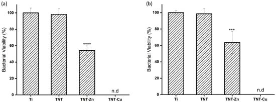 The antibacterial efficiency of TNT functionalized with Zn (TNT-Zn) or Cu (TNT-Cu) compared with the as-polished Ti6Al4V alloy (Ti) and anodized and heat-treated Ti6Al4V (TNT), against S. epidermidis after 2 h of incubation. (a) Planktonic bacterial viability (b) adherent bacterial viability. “n.d”—no viable bacteria were detected, i.e, 100% loss of bacteria viability. The data is expressed as a percentage of the means ± standard deviations (n = 5). A One-way ANOVA test was utilized to determine the level of significance against Ti samples: *** p < 0.001; **** p < 0.0001.