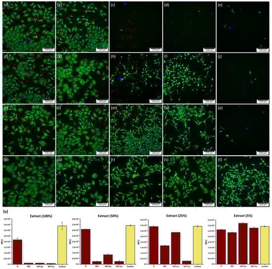 Cytotoxicity assessment of Ti, TNT, TNT-Zn, or TNT-Cu samples against MC3T3-E1 pre-osteoblast cells: fluorescence microscopy images detailing cell morphology for (a,f,k,p) control; (b,g,l,q) Ti; (c,h,m,r) TNT; (d,i,n,s) TNT-Zn; and (e,j,o,t) TNT-Cu. Blue—Hoechst and green—f-actin. Overall, anodized samples, independently of the presence of Cu or Zn, presented a marked cytotoxic effect against MC3T3-E1 pre-osteoblast cells. This toxic effect was less evident as the extract was more diluted: (a–e) Extract non-diluted (100%); (f–j) Extract at 50% (v/v); (k–o) Extract at 25% (v/v); (p–t) Extract at 5% (v/v). (u) Results of the resazurin viability tests of the produced samples for each extract dilution.