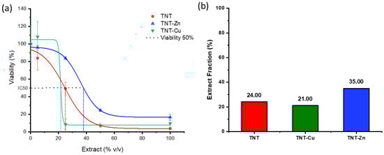 The concentration-dependent cytotoxic effect of extracts obtained by incubation of anodized (TNT, red) and functionalized with ZnNPs (TNT-Zn, blue) or CuNPs (TNT-Cu, green) in cell culture medium for 24 h, at 37 °C; (a) dose-response curve (b) extract concentration corresponding to the minimum viability of 50% (IC50) of MC3T3-E1 cells. Viability was measured through the resazurin assay.