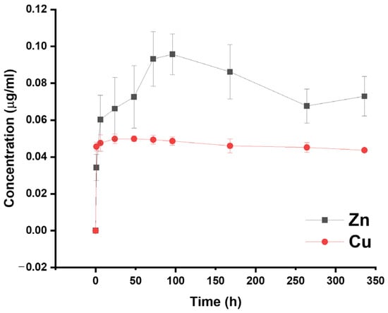 To further understand these results, a cumulative metal ion release of the produced samples was performed though ICP-AES. The results are depicted in Figure 9, which shows the cumulative ion release over 21 days for the TNT-Zn and TNT-Cu samples. For both compounds, there is a burst release in less than 24 h of immersion. After this initial burst release, the amount of Cu is quite constant, stabilizing around 0.045 µg/mL. The amount of Zn release, however, increases up to 4 days of immersion (96 h) and the cumulative ion release is overall higher than the amount of copper, due to the higher solubility of Zn in aqueous solutions. It peaks at around 0.12 µg/mL after 3 days of immersion, stabilizing at around 0.072 µg/mL for the remainder of time analyzed. The small variations could be due to replenishing the volume for each sample taken. Considering the results on the antimicrobial activity Zn- and Cu-decorated TNTs described in Section 3.4, these results seem to indicate that Cu can be more effective at lower concentrations than Zn.