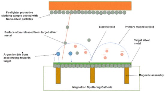 Magnetron sputtering is a physical vapor deposition process, where magnetically confined plasma is generated near the surface of the target metal (silver). Highly energetic ions with a positive charge collide with the surface of the negatively charged target metal. As a result, atoms are ejected from the target material, which then deposit on the surface of the substrate. Magnetron sputtering employs a strong magnetic field to confine electrons near the surface of the target material (metal). In consequence, the efficiency of the ionization process and deposition rate is enhanced, and plasma is created at a lower pressure [44,45]. A schematic diagram of magnetron sputtering is shown in Figure 2. Coating of silver particles on the outer shell of firefighter clothing samples was conducted by the DC-reactive magnetron sputtering equipment (Prevac, Rogów, Poland). At first, the deposition chamber was evacuated at 4 Pascals. The distance between the sample holder and the target (silver metal) was maintained at 15 cm. Later, these samples were placed in a physical vapor deposition (PVD) chamber. The silver particle layer was acquired by sputtering of pure 99.99 percent silver (Ag) in the presence of 100 percent Argon gas floating at a speed of 10 sccm (standard cubic centimeter per minute). The thickness of the layer was 1 um, and it was almost uniform throughout the surface of the fabric. At the time of sputtering, the working pressure was maintained at a pressure of 1.3 Pascals. The power of the magnetron supply was maintained at 615 watts, and the negative substrate bias voltage was maintained at 300 volts. After sputtering, the color of the coated samples changed to silver on the surface of the fabric [43].