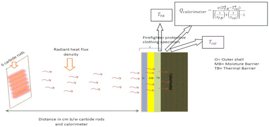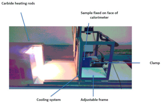 The X637 B radiant heat transmission machine uses the ISO 6942 standard to measure the transmission of heat through a material or material assembly. The temperature of the room was maintained between 15 °C and 35 °C. The radiant heat testing equipment was employed to investigate the radiant heat flux density through the material or material assembly according to the ISO 6942 standard. The apparatus consisted of six carbide rods serving as radiation heat sources, a small, curved copper plate calorimeter, and a movable test frame with a cooling device and sample holders as shown in Figure 3. At first, calibration was performed when the moveable screen was withdrawn and reverted to a point when a rise in temperature of 30 °C was reached, and the incident heat flux density Qₒ was measured. Afterwards, the sample was affixed to one side of the plate of the sample holder and held in contact with the face of the calorimeter, applying a mass of 200 g. The movable screen was withdrawn, and the starting point of the radiation was recorded. The movable screen was returned to its closed position after a temperature rise of about 30 °C was reached. The size of the sample was 230 mm × 80 mm. The time for temperature accelerations of 12 °C and 24 °C in the calorimeter was determined, and conclusions are mentioned in the form of the radiant heat transmission index (RHTI 12 and RHTI 24), the percentage heat transmission factor (percentage TF Qo) and the transmitted heat flux density Qc [48]. Before experimentation, all samples were pre-conditioned for 24 h at a temperature of 20 °C and had a relative humidity of 65 percent [48]. Three samples were required for testing at each level of heat flux density. Incident heat flux density is evaluated using Equation (1).
