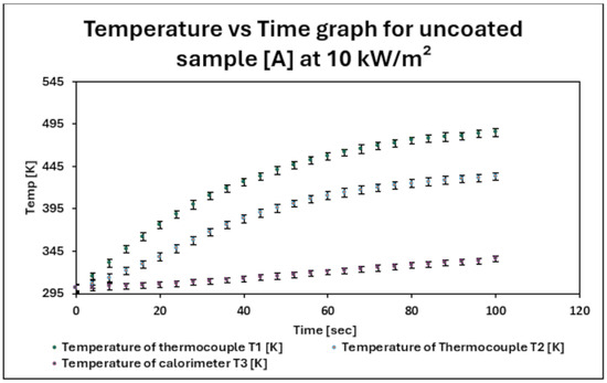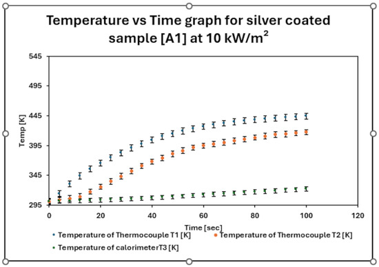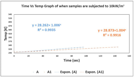 Figure 7 shows the time vs. temperature values of uncoated and silver-coated samples when subjected to 10 kW/m2. It was noted that a flatter curve was obtained for silver-coated samples A1. On the other hand, a relatively steep curve was obtained for uncoated samples A. This indicated that the rate of the rise in temperature of silver-coated samples A1 took place at a slower rate as compared to uncoated samples A [43].