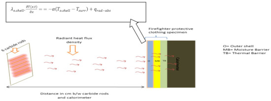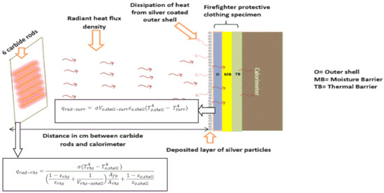 The thermal energy from the heating source to the surface of the cloth is transported due to thermal radiation and convection of air. In this scenario, the mode of radiation is dominant as compared to convection. The radiant heat transmission between the heating source and the outer shell is dependent on the differentiation of temperature and radiation view factor, as shown in Figure 8 [27,42,43].