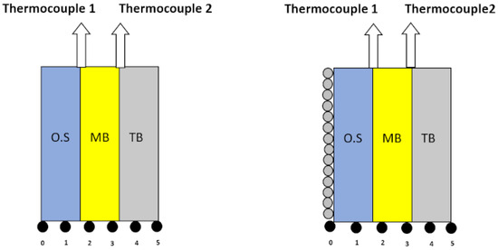 where is the temperature field under investigation and is the total time during which we investigate the temperature field. This equation is a second-order transient parabolic differential equation. It was assumed that textile material was homogeneous and isotropic. Therefore, the values of , and are assumed to be constant. designates the Vector Hamilton operator in a Cartesian coordinate system. is the part of radiation absorbed by the outer shell from the radiant heat source. It was assumed that the textile material was homogeneous and isotropic. Therefore, the values of , and are assumed to be constant [49,50,51,52].