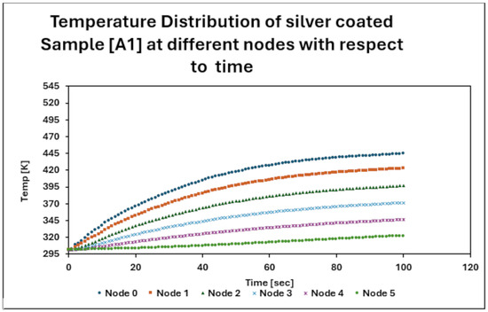 It can be witnessed from Figure 12 and Figure 13 that there was a sequential increment in the rise in temperature for different curves with an increase in time. However, this increment was not in a linear form. It was also noticed that as the number of nodes increased, there was a decline in the values of temperature for the same time period. This indicates a decline in temperature values with an increase in the thickness of firefighter clothing assemblies for both uncoated samples A and silver-coated samples A1.