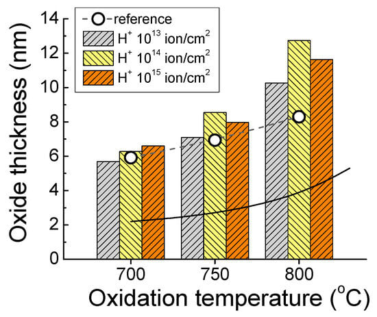 The oxides on implanted Si are thicker compared to the respective reference ones, indicating the faster oxidation process into the H+-modified surface layers [13]. The higher the implantation fluence, the smaller the thickness of the implanted layer is, due to the formation of highly hydrogenated Si subsurface regions that hinder further H-penetration into the Si bulk. The oxidation rates of the reference oxides, grown in non-implanted Si, is also higher as compared to those reported in the literature for dry oxidation of c-Si wafers [18]. This suggests that in the same oxidation run, due to the elevated temperatures, part of the implanted H releases from the samples and could form water molecules or O-H radicals interacting with the neighboring Si surface of reference samples. Most likely, the presence of hydrogen in the Si subsurface layer or on the Si surface is the cause of faster oxidation, resembling the kinetics of wet oxidation [10]. Obviously, the oxidation kinetics of these samples lies between the standard wet [10] and dry oxidation kinetics of silicon [18] (Figure 1).