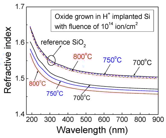Independently of the pre-history of the oxidized samples, the refractive index values decreased with increased oxidation temperature. This is illustrated in Figure 2 for the oxides grown into H+-implanted Si substrates at 700 °C, 750 °C and 800 °C. As can be seen, the reference oxides have considerably higher refractive index values, pointing to the rather high compressive stress generated during the dry oxidation process due to lattice mismatch between SiO2 and Si substrate and, consequently, to volume expansion occurring in the oxidation process [14]. However, H+ implantation creates favorable conditions for the growth of oxides in a less dense and tense Si structure [13]. Most probably, the presence of hydrogen provides a larger amount of Si dangling bonds formed during the implantation process in an amorphized Si subsurface layer, which facilitates the faster growth of oxides at considerably lowered temperatures.