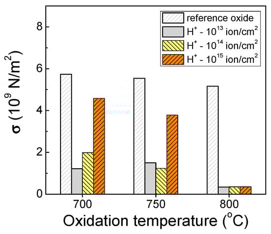 Using the above ellipsometric data of the refractive index values, the oxidation-induced stress in grown oxides can be estimated. Assuming that the observed changes in the oxide density and its refractive index are caused by elastic compression, the oxide stress can be calculated from the first-order compressibility, expressed as nox = n0 + (Δn/Δσ)σ [19], where σ is the stress and Δn/Δσ is the compressive coefficient and taken for silica equal to 9 × 10−12 m2/N. The refractive index n0 is equal to 1.46 for a free-of-stress SiO2. Historically, the mechanical stress values are usually calculated at a single wavelength (usually at λ = 633 nm), as these values give the tendency of evaluation of built-in stress during the processes. Therefore, we estimated the oxidation-induced stress from the nox values also at λ = 633 nm to be comparable with the reported values by other authors for other technological conditions and thicker oxides. The stress values estimated from the refractive indices represent the total oxide stress, which is the sum of the thermally-induced stress due to differences in the thermal expansion of the Si and SiO2 and the intrinsic oxide stress generated by its growth. Here, we examine the total stress without extracting the thermal stress component, since the intrinsic oxide stress we estimated later when considering the dielectric functions. The results are summarized in Figure 3. The stress in the oxides grown in non-implanted Si is compressive and shows a tendency to slightly decrease with an increase in the oxidation temperature from 700 °C to 800 °C, temperatures which in principle are considered to be low in Si technology. The oxide stress for the H+-implanted samples shows a tendency to increase with increasing H+ fluence for a given temperature and to decrease with enhanced temperature, but its level remains considerably lower in all cases compared to that for reference oxides. Apparently, the presence of H species in a PII-modified, less dense Si subsurface layer promotes/facilitates the release of process-induced structural strains in the oxide matrix. As a result, at 800 °C the oxidation-induced stress level becomes an order of magnitude lower regardless of the H+ fluence during PII (Figure 3).