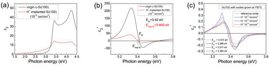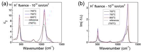 Further, we analyzed the optical characteristics which contain information about the absorption properties, namely, the imaginary ε2 part of the dielectric function ε and the dielectric loss function Im (−1/ε). In Figure 8, as an example, the results for the Si samples implanted with a H+ ion fluence of 1014 ion/cm2 and subsequently oxidized at different temperatures are given.