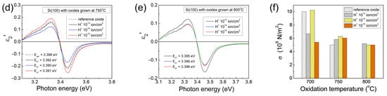 The position of the E1 peak of the virgin non-implanted Si (100) substrate is at E1 = 3.42 eV and is shifted toward E1 = 3.405 eV by increasing the fluence of implanted H+ ions up to 1015 ion/cm2 (see Figure 4b). The magnitude of the E1 displacement varies with the given technological processes, and its values are included in the corresponding figures in Figure 4. For oxides grown at higher temperatures on hydrogen-implanted Si, the displacement of E1 is smaller. Knowing the E1 peak positions, the corresponding stress levels can be calculated from the relationship of ΔE1 × c, where c is the correlation coefficient and equal to 2.09 × 1010 Nm−2eV−1 for thermally grown SiO2 [5]. The results are presented in Figure 4f. As is seen, structural stress values, generated in the oxide and appearing at the Si–SiO2 interface, are in the order of 108 N/m2 and well correlated to those reported in the literature [5,18,19]. However, at a low (700 °C) temperature, the oxidation of H+-implanted silicon generates smaller structural strains at the Si–SiO2 interface in comparison to those of the reference oxides, which is most likely due to a beneficial effect of the presence of hydrogen species in the layer-growing process. By increasing the oxidation temperature, an overall reduction in the stress can be observed.