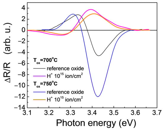 The investigated non-implanted and oxidized Si reference samples exhibit ER spectra with the shape and polarity typical for the p-type Si substrate. For the H+-implanted Si samples, gradual change is observed, and for a 1015 ion/cm2 H+ fluence, the polarity of the ER spectra is inverted. In Figure 5, as an example, the ER spectra for oxides grown at 700 °C and 750 °C on implanted Si with a H+ fluence of 1015 cm−2 are given. The opposite ER signal for the highest ion fluence is indicative of an inversion of the surface field [24] and can be attributed to the thin subsurface layer with implantation defects. The defect concentration, however, cannot be high, since otherwise it would hinder the ER signal [17].