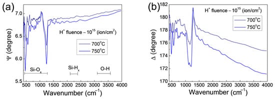 IRSE spectra of ellipsometric angles Ψ (a) and Δ (b) of H+-implanted Si (fluence 1015 ion/cm2) after its thermal oxidation at 700 °C and 750 °C in dry O2.
