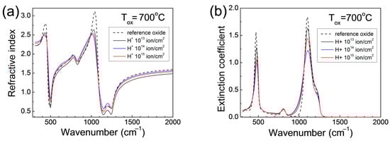 According to the above observations, further only the 400–2000 cm−1 IRSE region is considered where the vibrational bands related to Si-O chemical bonds are well pronounced. This is well seen in Figure 7, where the dispersion dependencies of n and k are presented for oxides grown into non-implanted and H+-implanted Si at 700 °C. The IR spectra of the samples oxidized at 750 °C and 800 °C are not given here because they have similar shapes and trends. The obtained dispersion curves are well correlated to those reported for thin silicon oxide grown at temperatures below 1000 °C [33,34].