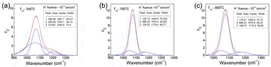 The complex shape of the spectral bands in Figure 8 implies the existence of Si-O chemical bonding in different configurations. To obtain better insights, we deconvoluted the main Si-O bands into Gaussian components. The obtained multiple Gaussian peaks with close positions to each other suggest that the Si-O chemical bonds could be with different bond angles or configurations [35,36]. For illustration purposes, in Figure 9 the deconvoluted main peaks with the Gaussian components, related to the stretching vibrational mode of oxygen, are shown for oxides grown at different temperatures in Si implanted with a H+ fluence of 1013 ion/cm2.
