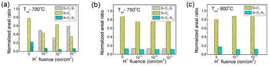 In dependence on the technological conditions, the amount of Si-O3-Si, Si-O4 and Si-O2-Si2 complexes changes. In Figure 10, these changes are demonstrated by the variation of the main characteristic peak area in the IR spectra. Each area of the Gaussian peaks is normalized to the total peak area. At low temperature and low H+ fluence, the predominant complex in the oxides is the non-stoichiometric Si-O3-Si bonds. By increasing the temperature, the oxide becomes more stoichiometric and the Si-O4 configuration predominates (Figure 10b,c).