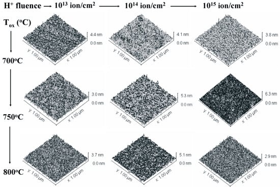 Three-dimensional AFM topographic images recorded at the scale of 1 µm × 1 µm, ordered by increasing H+ fluence from left to right and by increasing the oxidation temperature from top to bottom.