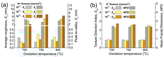 For the samples implanted at a 1014 ion/cm2 H+ fluence (middle column in Figure 11), some randomly distributed local non-homogeneities are present, which are most probably formed during the oxidation process. This is reflected in the increase in the roughness parameters, as the Sy values increase from ~4 nm to ~5 nm by increasing the oxidation temperature from 700 °C to 750 °C, and in the average roughness (Sa), which doubles its value from 0.17 to 0.37 nm. Simultaneously, the texture direction index, Stdi, undergoes a slight decrease caused by the appearance of local non-uniformities (irregular oxide clusters), but the samples preserve the isotropic texture.