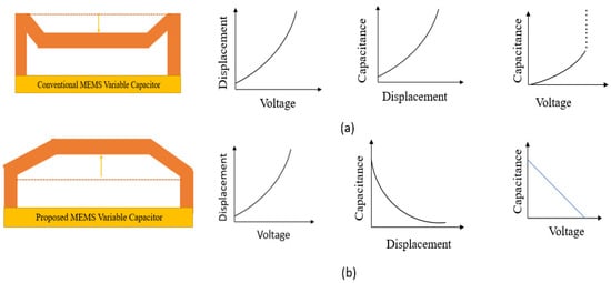 Schematic view of the (a) conventional MEMS variable capacitor and (b) proposed MEMS variable capacitor showing linear capacitance–voltage response.