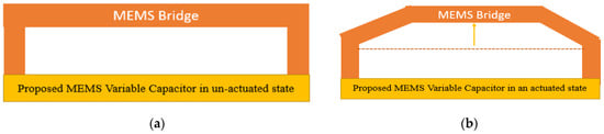 After applying the voltage in the electrostatic actuator, electric force is formed between the plates causing the top plate to move. The s-shaped beam is employed here to drive the capacitor plate in the rising gap direction. So, the upstate capacitance will be minimal due to the rising movement of the capacitor plate. Consequently, the tuning ratio will be maximum. Figure 3a,b shows the simplified view of the RF MEMS variable capacitor before and after applying the voltage.