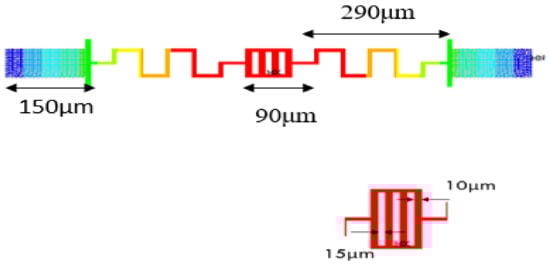 Aluminum is utilized for bridge material. Primarily, there is a 3 μm gap between the plates. After exposure of voltage in the electrostatic actuator plates, the electric force is generated causing the top plate to move in the decreasing gap direction due to force. The s-shaped beam is utilized to increase the gap between the plates in the varactor part. There are slices in the capacitor plate to increase the area tunability of the varactor. Slices in the capacitor plate are also essential to avoid stiction issues and have the fast switching speed of the device. Figure 4 shows the dimensions of the planned RF MEMS variable capacitor.