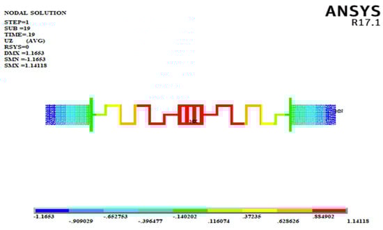 The ANSYS findings are displayed in Figure 5, in which the movement of the actuator plate is shown in a downward position and the movement of the capacitor plate is shown in the opposite direction of the actuator plate. It demonstrates the actuator plate displacement of 1.16 μm in the downward direction, while the capacitor plate displacement of 1.14 um is shown in the increasing gap direction. The design parameters of the proposed RF MEMS varactor are listed in Table 1.