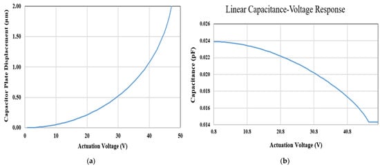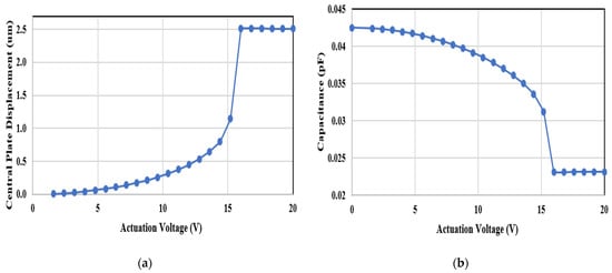 Figure 6a,b displays the displacement of the capacitor plate and up capacitance respectively at different voltages. Based on Figure 6, the maximum central plate displacement of 1.14 um in the upward direction is achieved at 15.2 V.